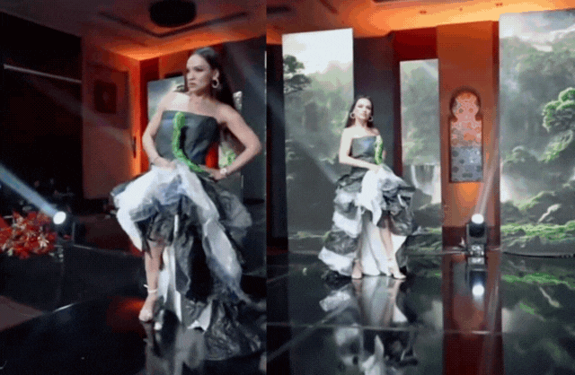 Màn biểu diễn bung skill múa may, ngả nghiêng hết cỡ của đại diện Uzbekistan trong phần thi Trang phục sinh thái và Trang phục dạ hội tại Miss Eco International 2025 (Nguồn: Ortega Cruella in pagenantry)