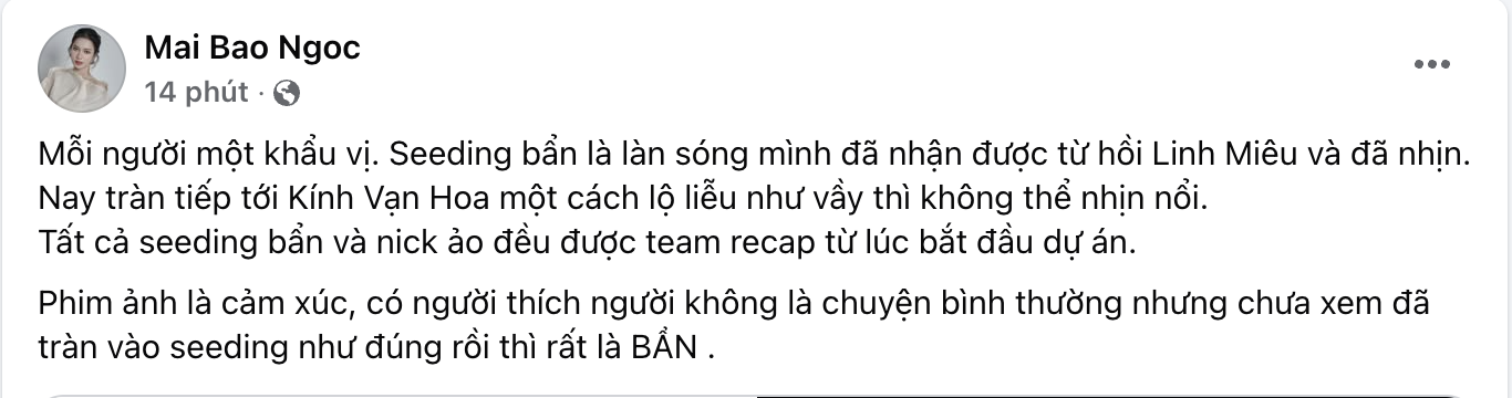 Về phía NSX Mai Bảo Ngọc, cô share lại bài viết của chồng và thể hiện quan điểm đồng thuận. Bà xã của đạo diễn Võ Thanh Hoà bức xúc vì làn sóng seeding bẩn đã xuất hiện từ phim Linh Miêu và ngày càng lộ liễu hơn ở Kính Vạn Hoa: Bắt Đền Con Ma. Cô viết: "Mỗi người một khẩu vị. Seeding bẩn là làn sóng mình đã nhận được từ hồi Linh Miêu và đã nhịn. Nay tràn tiếp tới Kính Vạn Hoa một cách lộ liễu như vầy thì không thể nhịn nổi. Tất cả seeding bẩn và nick ảo đều được team recap từ lúc bắt đầu dự án. Phim ảnh là cảm xúc, có người thích người không là chuyện bình thường nhưng chưa xem đã tràn vào seeding như đúng rồi thì rất là bẩn".