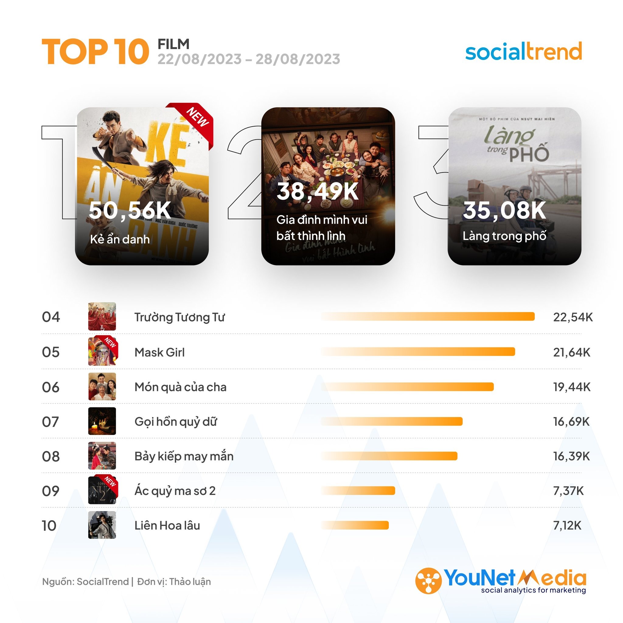 Bộ điện ảnh Kẻ Ẩn Danh dành vị trí đầu bảng trong top 10. Tác phẩm vừa được công chiếu mới đây với sự tham gia của dàn diễn viên quen thuộc Kiều Minh Tuấn, Mạc Văn Khoa, Quốc Trường, Vân Trang,... Theo Younet Media, thảo luận đến từ các Fanpage nổi tiếng trên Facebook chiếm 56.8%, và Tiktok với 36.2%. Kẻ Ẩn Danh chính thức công chiếu vào ngày 25/8, sau ba ngày đã đạt doanh thu hơn 10 tỷ đồng.