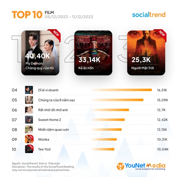 Mới đây, trang YouNet Media đã tung ra bảng xếp hạng những từ khóa hot nhất mạng xã hội tuần qua (5/12 - 11/12). Trong đó, danh sách 10 bộ phim hot lập tức nhận được nhiều sự quan tâm từ khán giả.