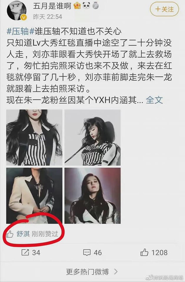 Trong lúc vụ việc Chu Nhất Long cướp suất đi thảm đỏ của Lưu Diệc Phi là tâm điểm bàn tán của dư luận Trung Quốc. Trên mạng xã hội, nam nghệ sĩ bị chỉ trích dữ dội thì mới đây nhất, cư dân mạng lại vô tình phát hiện ra "chị đại" Thư Kỳ nhấn "like" bài viết với nội dung liên quan tới việc Lưu Diệc Phi "cứu" BTC khi thảm đỏ bị trống 20 phút do không có ai lên.