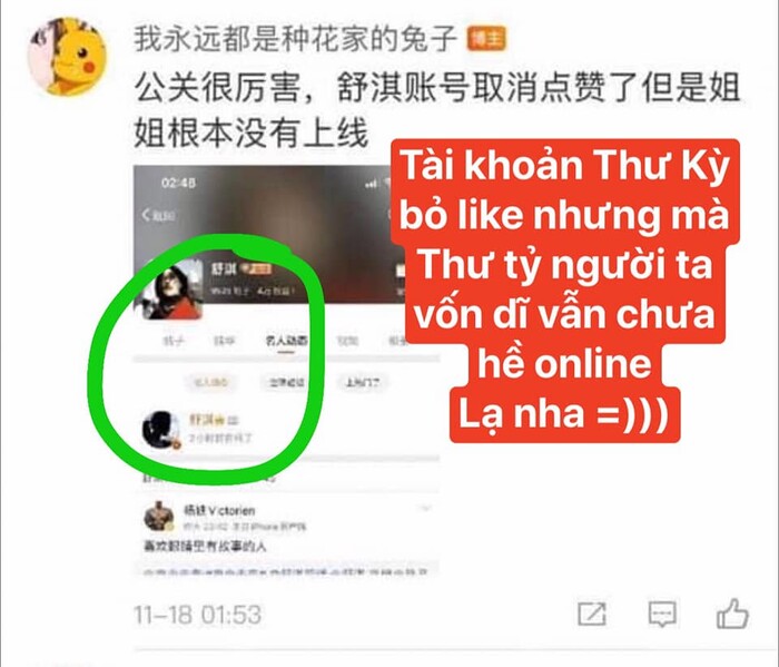 Netizen phát hiện Thư Kỳ nhấn like (hiện đã bỏ like sau hơn 2 tiếng) 1 bài đăng của blogger đá xéo Chu Nhất Long có nội dung như sau: