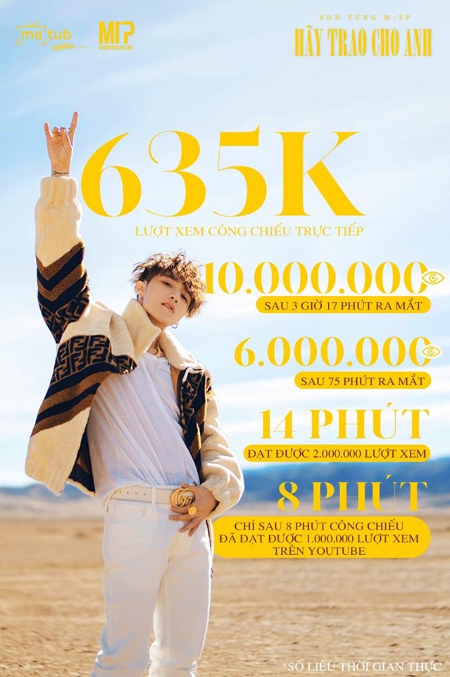 02/07/2019 16:0612 tiếng sau khi Sơn Tùng 'thả xích' MV' Hãy trao cho anh: #1 Việt Nam, #1 Châu Á, #1 Thế giới và nhiều hơn thế nữa!