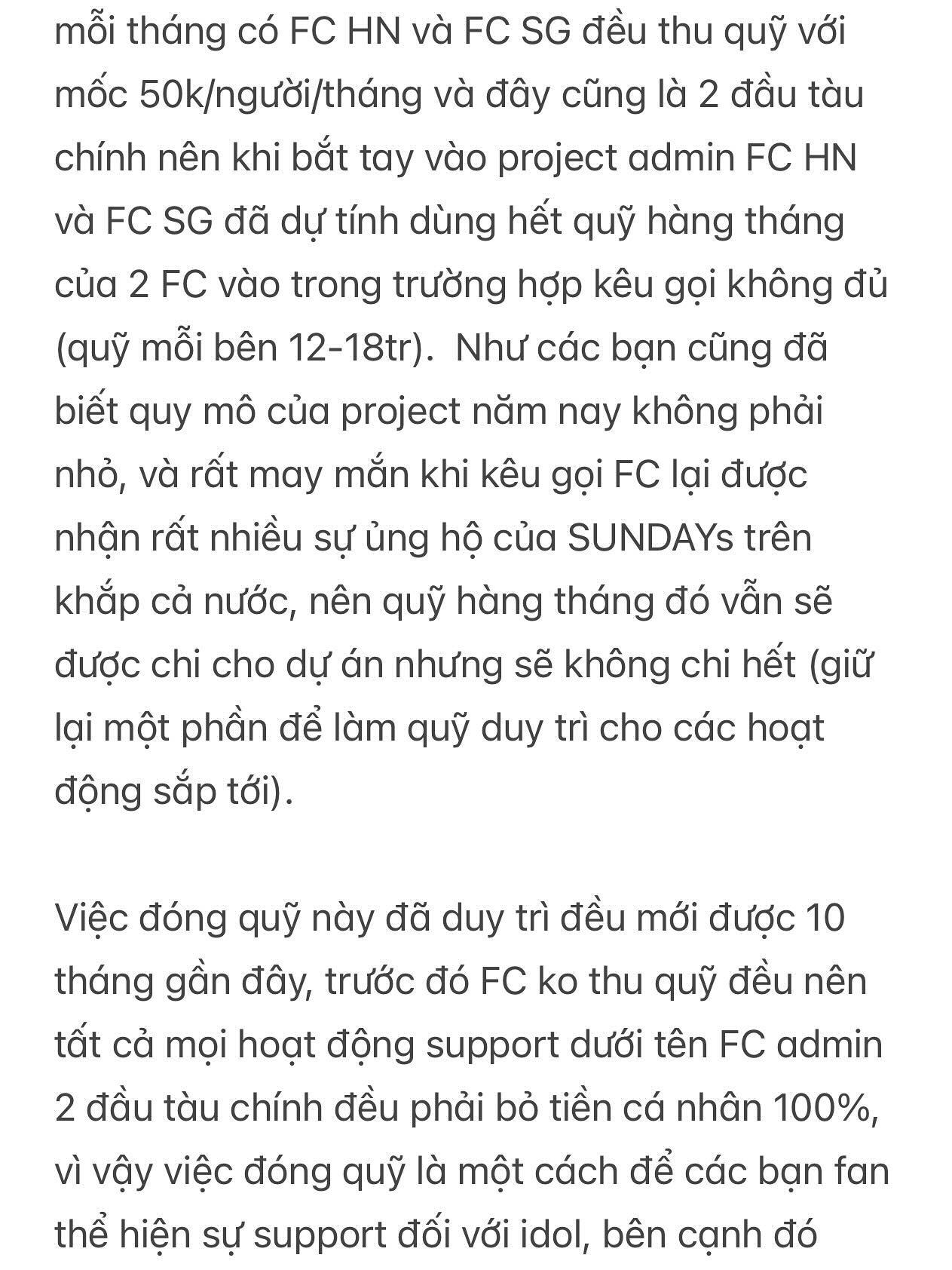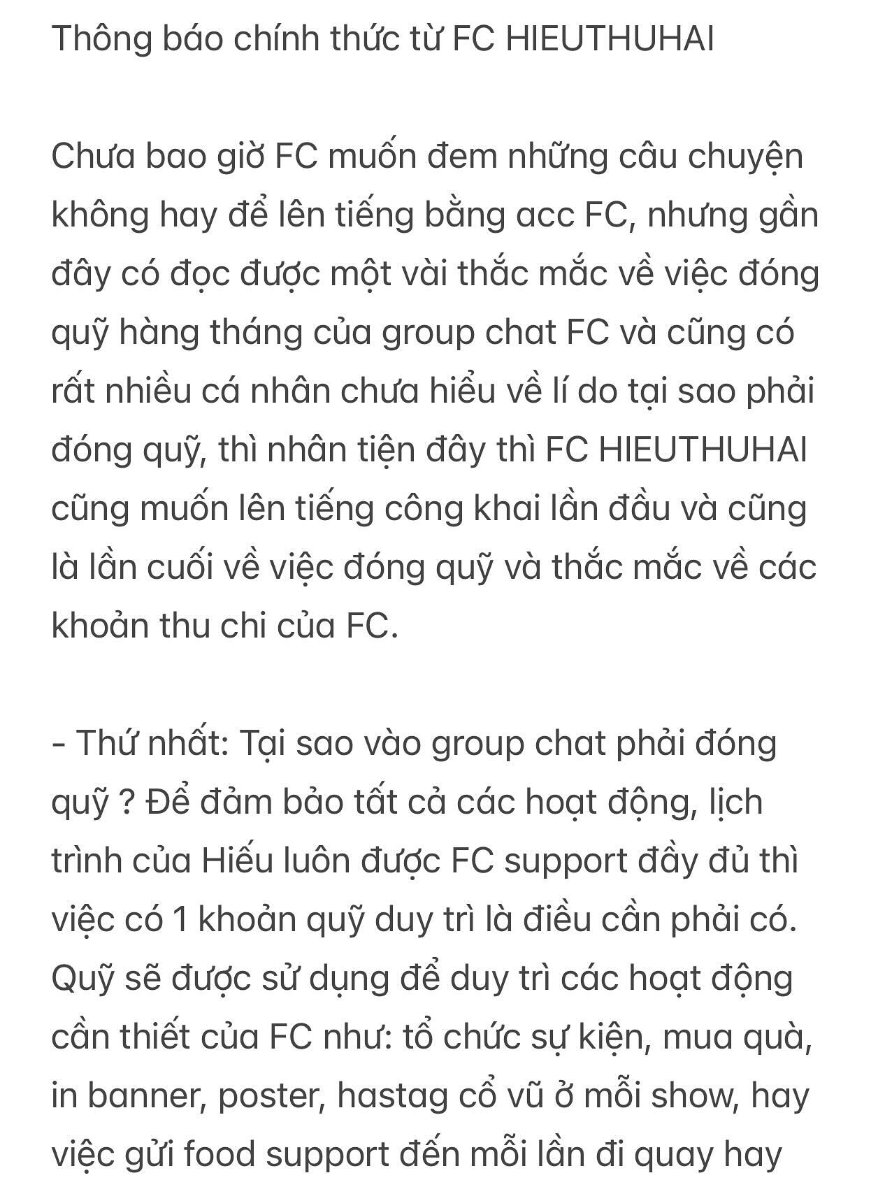 Theo bài đăng mới nhất, FC HIEUTHUHAI đưa ra lý do phải đóng quỹ để tham gia group chat. Quan trọng nhất là để có chi phí duy trì các hoạt động của FC như tổ chức sự kiện, mua quà, in banner, poster cổ vũ, gửi foodtruck ủng hộ cho các lịch trình của HIEUTHUHAI.
