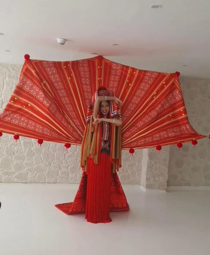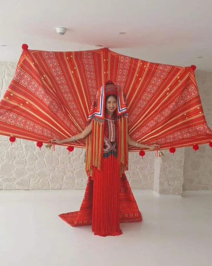"Cô em Dao đỏ" lấy cảm hứng từ trang phục cưới của phụ nữ Dao đỏ với những họa tiết thổ cẩm đặc trưng. Thiết kế có màu sắc rực rỡ, phần cánh rộng có thể điều chỉnh trong khi trình diễn.
