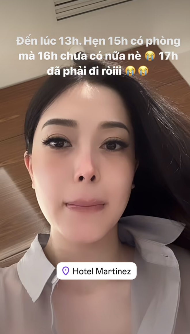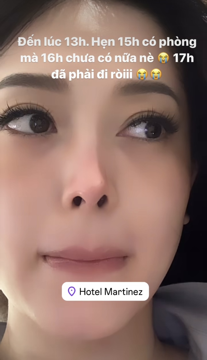 Cụ thể, bà xã Bình An viết: "Đến lúc 13 giờ. Hẹn 15 giờ có phòng mà 16 giờ chưa có nữa nè. 17 giờ đã phải đi rồi". Dù đã ngồi đợi tới 3 tiếng nhưng người đẹp 9x vẫn chưa nhận được phòng ở khách sạn. Kèm theo đó, Á hậu Phương Nga chia sẻ hình ảnh cận gương mặt đầy lo lắng suy tư của bản thân.