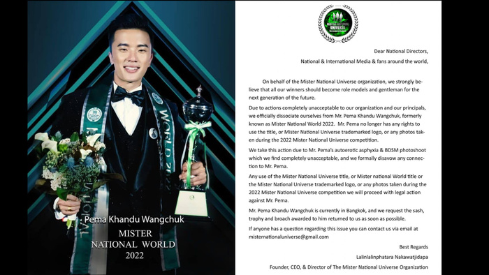 Do những hành động hoàn toàn không thể chấp nhận được đối với ban tổ chức, chúng tôi chính thức tước danh hiệu của Pema Khandu Wangchuk. Theo đó, Pema không còn quyền sử dụng danh hiệu của mình để quảng bá cho cuộc thi Mister National Universe 2022".
