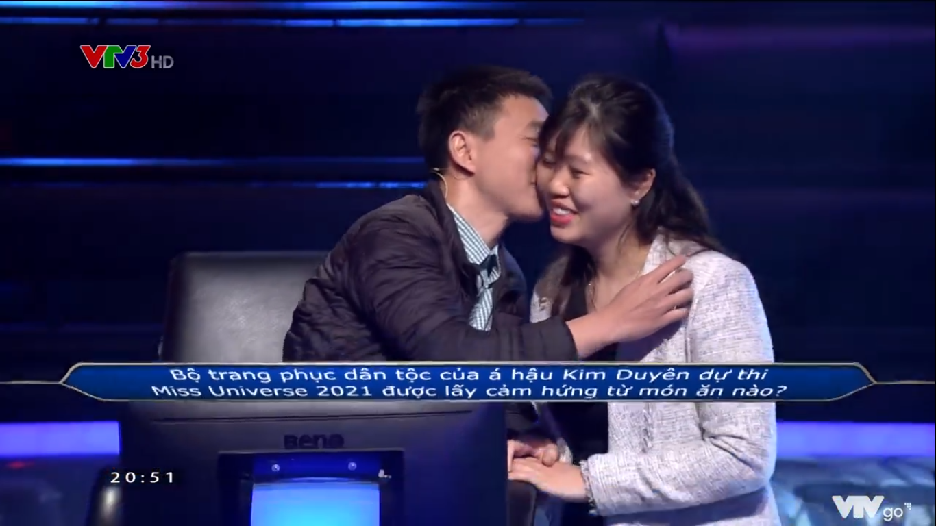Bước vào phần thi, anh gặp khó ở câu số 8 và cần sự trợ giúp của bà xã. Sau khi nhận được kết quả trả lời hoàn toàn chính xác, anh Phát đã không ngại ngần thể hiện tình cảm với vợ trên sóng truyền hình. Anh nói với bà xã “cho anh thơm cái” và nhẹ nhàng đặt một chiếc hôn tình cảm lên má của vợ.