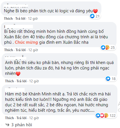 Tuy nhiên, sau đó Xuân Bắc đã xuất sắc vượt qua câu hỏi số 12 và ra về với phần thưởng trị giá 40 triệu đồng. Theo dân mạng, phần thưởng lớn của Xuân Bắc có sự đóng góp không hề từ cậu con trai và chính Bi Béo cũng phải thốt lên: 'Bố chọn đúng người đồng hành rồi đấy'.