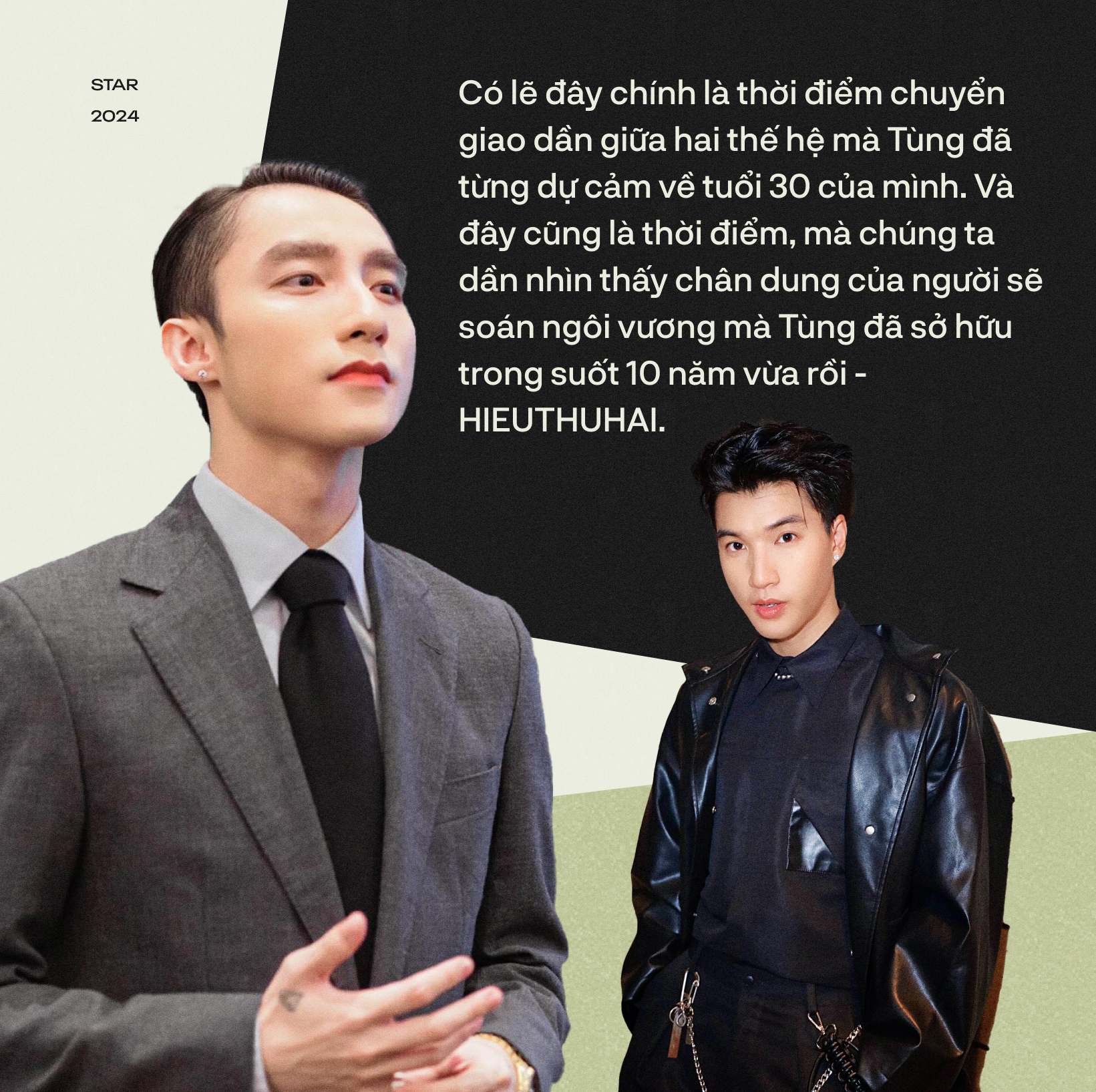 Như sự sắp đặt của số phận, 2024 cũng là năm mà Sơn Tùng chính thức tròn 30 tuổi. Có lẽ đây chính là thời điểm chuyển giao dần giữa hai thế hệ mà Tùng đã từng dự cảm về tuổi 30 của mình. Và đây cũng là thời điểm, mà chúng ta dần nhìn thấy chân dung của người sẽ soán ngôi vương mà Tùng đã sở hữu trong suốt 10 năm vừa rồi - HIEUTHUHAI.