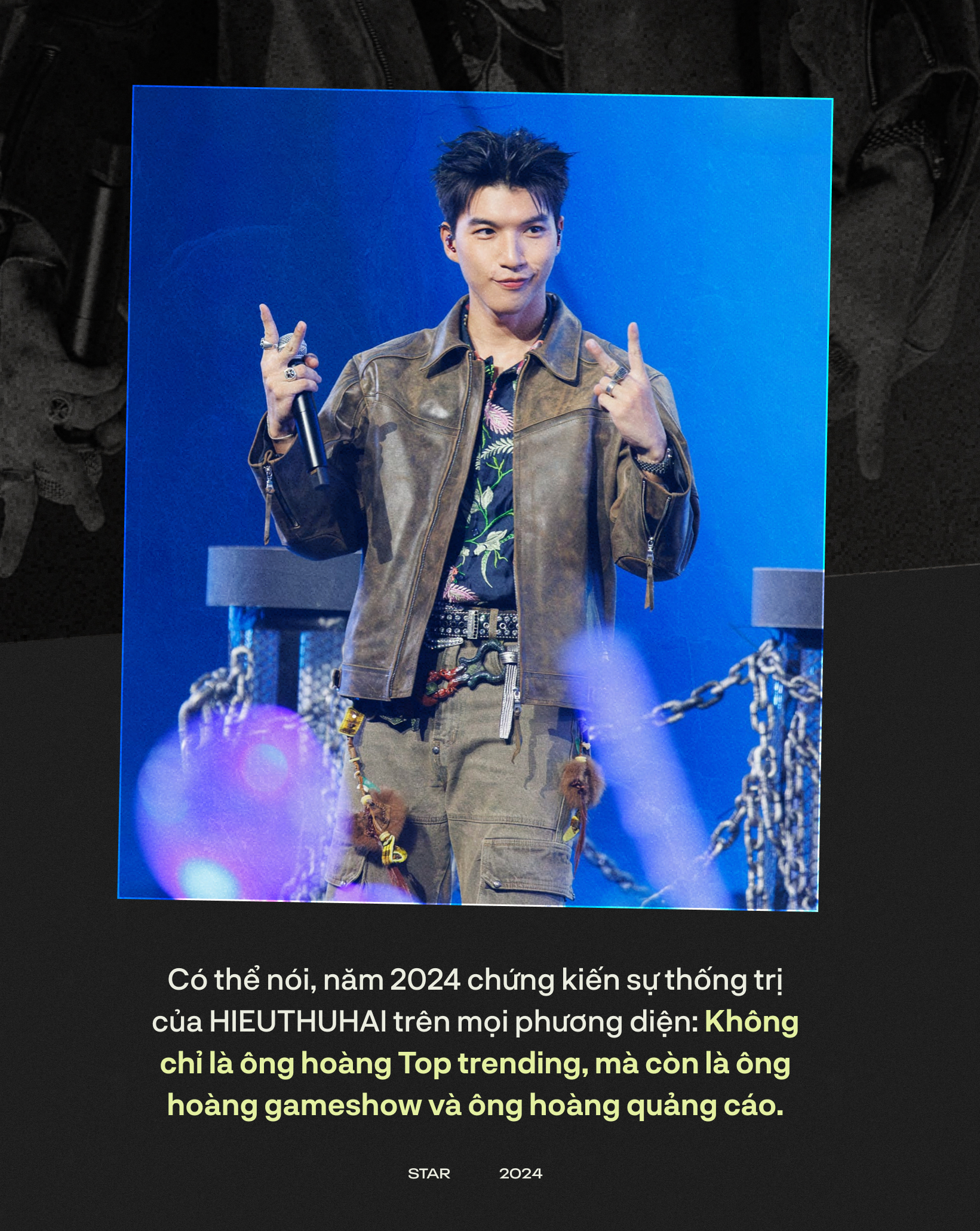 Đây cũng là điểm khác biệt đã giúp HIEUTHUHAI phủ sóng và nâng cấp giá trị của mình chỉ trong một thời gian ngắn. Năm 2023, khán giả có thể thấy HIEUTHUHAI vụt lên thành một hiện tượng và đã bắt đầu thấy lờ mờ hình ảnh của một ngôi sao lớn ở Hiếu. Tuy nhiên để nói về việc có thể thay thế được Tùng hay không - thì lại vẫn… thiêu thiếu cái gì đấy mà có lẽ rất lâu nữa mới thể đuổi kịp. Nhưng mọi chuyện đã đổi chiều vào năm nay. Có thể nói, năm 2024 chứng kiến sự thống trị của HIEUTHUHAI trên mọi phương diện: Không chỉ là ông hoàng Top trending, mà còn là ông hoàng gameshow và ông hoàng quảng cáo.