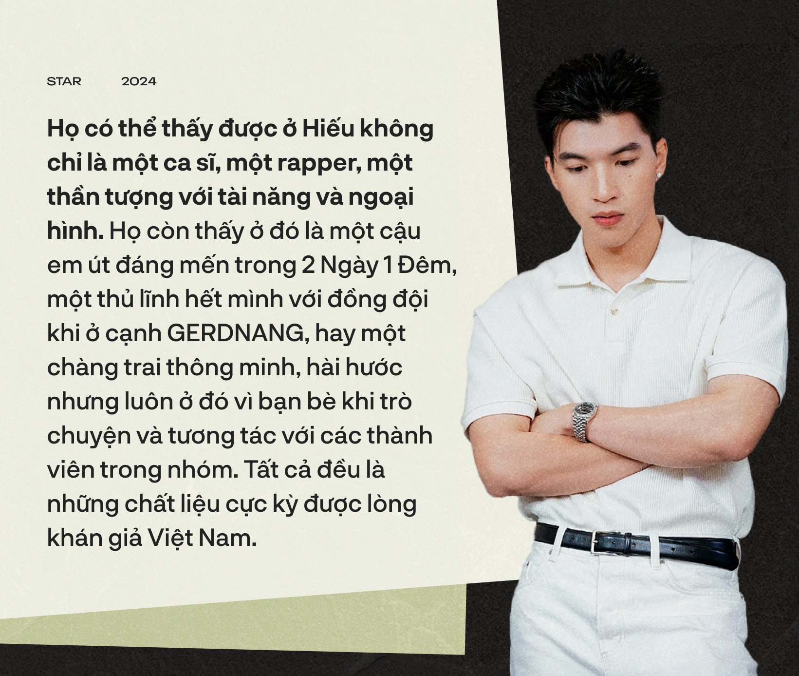 HIEUTHUHAI lại là một câu chuyện khác. Ở Hiếu, cái cảm giác về sự chân thật trở nên rõ ràng hơn, dù cậu cũng có những sự tiết chế nhất định để bảo vệ đời sống riêng tư. Việc tham gia nhiều show truyền hình giúp Hiếu đưa cá tính của mình đến gần hơn với khán giả. Họ có thể thấy được ở Hiếu không chỉ là một ca sĩ, một rapper, một thần tượng với tài năng và ngoại hình. Họ còn thấy ở đó là một cậu em út đáng mến trong 2 Ngày 1 Đêm, một thủ lĩnh hết mình với đồng đội khi ở cạnh GERDNANG, hay một chàng trai thông minh, hài hước nhưng luôn ở đó vì bạn bè khi trò chuyện và tương tác với các thành viên trong nhóm. Tất cả đều là những chất liệu cực kỳ được lòng khán giả Việt Nam.