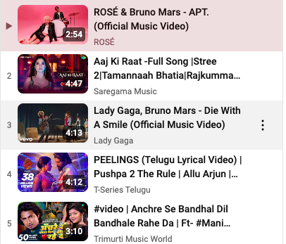 Mới đây, YouTube Music Global Chart, một trang web thống kế số liệu của YouTube, đã chính thức tung ra BXH 100 MV hàng đầu trên thế giới tuần này. Bên cạnh những cái tên nổi bật như APT. (hạng 1), Die With A Smile (hạng 2), toxic till the end (hạng 6), Birds Of A Feather (hạng 17)... Đáng chú, danh sách này còn xuất hiện 1 gương mặt gây bất ngờ lớn - Dương Domic.