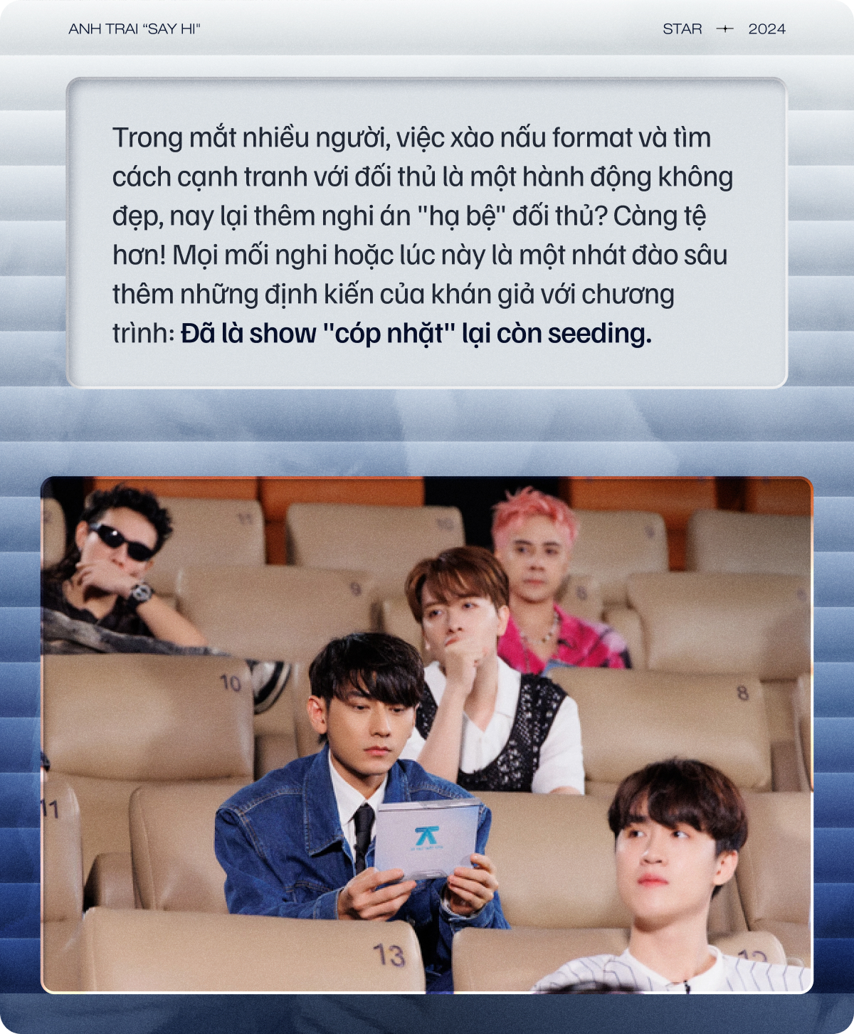 Nhưng sự bức xúc này chưa phải một vấn đề quá lớn, mọi chuyện chỉ xấu đi khi ekip Anh Trai Say Hi vướng nghi án truyền thông và seeding hạ bệ ATVNCG. Về cơ bản, việc truyền thông và seeding để thể hiện những lợi thế của mình trước đối thủ là không sai. Bản thân các bài post ẩn danh trên MXH cũng chẳng thể khẳng định được tin đồn "truyền thông bẩn". Thế nhưng, số đông cư dân mạng luôn tin vào những gì mình cảm nhận. Và trong mắt nhiều người, việc xào nấu format và tìm cách cạnh tranh với đối thủ là một hành động không đẹp, nay lại thêm nghi án "hạ bệ" đối thủ? Càng tệ hơn! Mọi mối nghi hoặc lúc này là một nhát đào sâu thêm những định kiến của khán giả với chương trình: Đã là show "cóp nhặt" lại còn seeding.
