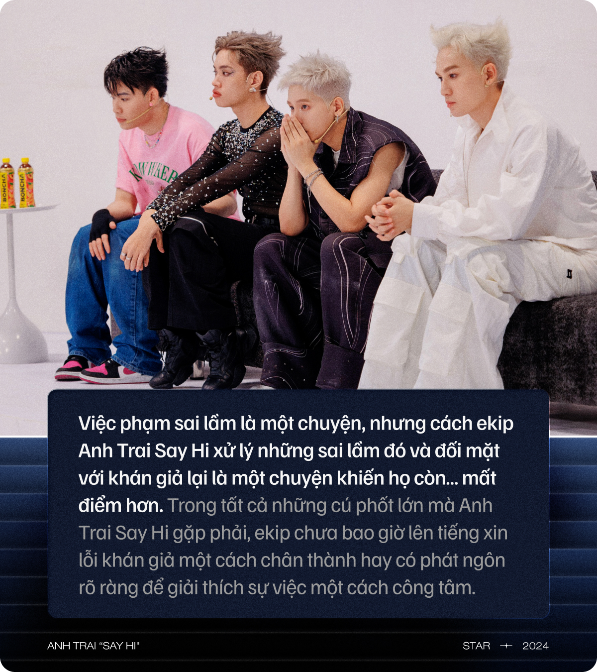 Việc phạm sai lầm là một chuyện, nhưng cách ekip Anh Trai Say Hi xử lý những sai lầm đó và đối mặt với khán giả lại là một chuyện khiến họ còn… mất điểm hơn. Trong tất cả những cú phốt lớn mà Anh Trai Say Hi gặp phải, ekip chưa bao giờ lên tiếng xin lỗi khán giả một cách chân thành hay có phát ngôn rõ ràng để giải thích sự việc một cách công tâm. Gần đây nhất, trong cuộc ồn ào giữa nhóm của Anh Tú/ Captain và ca sĩ Hoàng Dũng, ekip Anh Trai Say Hi lại tiếp tục trở thành đối tượng bị khán giả lên án mạnh mẽ khi thả trôi cho thí sinh lẫn nghệ sĩ tham gia cộng tác với mình trở thành đề tài bị công kích trên khắp các mạng xã hội. Họ giữ thái độ im lặng, để các thí sinh lẫn nhạc sĩ tự làm việc với nhau như là những va chạm cá nhân, không thuộc về phạm vi chương trình. Hoàn toàn không có một động thái nào để đứng ra bảo vệ hoặc dàn xếp - việc mà một đơn vị tổ chức sản xuất có trách nhiệm cần phải làm. Nó giống như một cách ngầm tuyên bố rằng "đó là chuyện tranh chấp cá nhân, còn chương trình chúng tôi chẳng hề liên quan?".