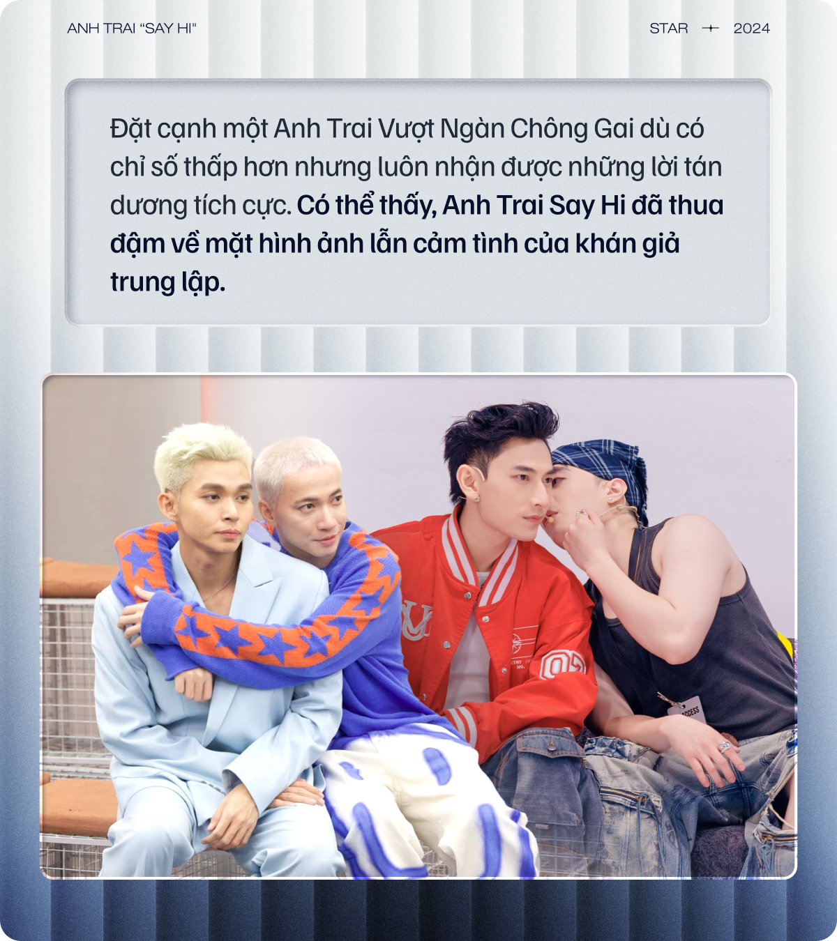 Khi yêu, người ta có hàng vạn lý lẽ để bảo vệ. Khi ghét, họ cũng có cả vạn lý do để phủ nhận. Việc không có được brand love như ATVNCG đã tạo ra sự thiệt thòi lớn về mặt hình ảnh cho chính các thí sinh lẫn chương trình Anh Trai Say Hi. Ở thời điểm hiện tại, bất cứ ai khen Anh Trai Say Hi cũng đều bị cho là con nít - dù người đó có khẳng định mình đã… U40. Trong các bảng xếp hạng sự quan tâm của MXH, kể cả Anh Trai Say Hi có chỉ số cao hơn thì cư dân mạng đều chỉ chăm chăm thả "HAHA" và cho rằng: Say Hi được quan tâm nhiều hơn vì… nhiều phốt. Giữa làn sóng phản đối, rất nhiều người đã phải lên tiếng: Hãy ngưng vì ghét Anh Trai Say Hi mà phủ nhận nỗ lực, hạ thấp sự cố gắng của các nghệ sĩ trong line-up của chương trình.