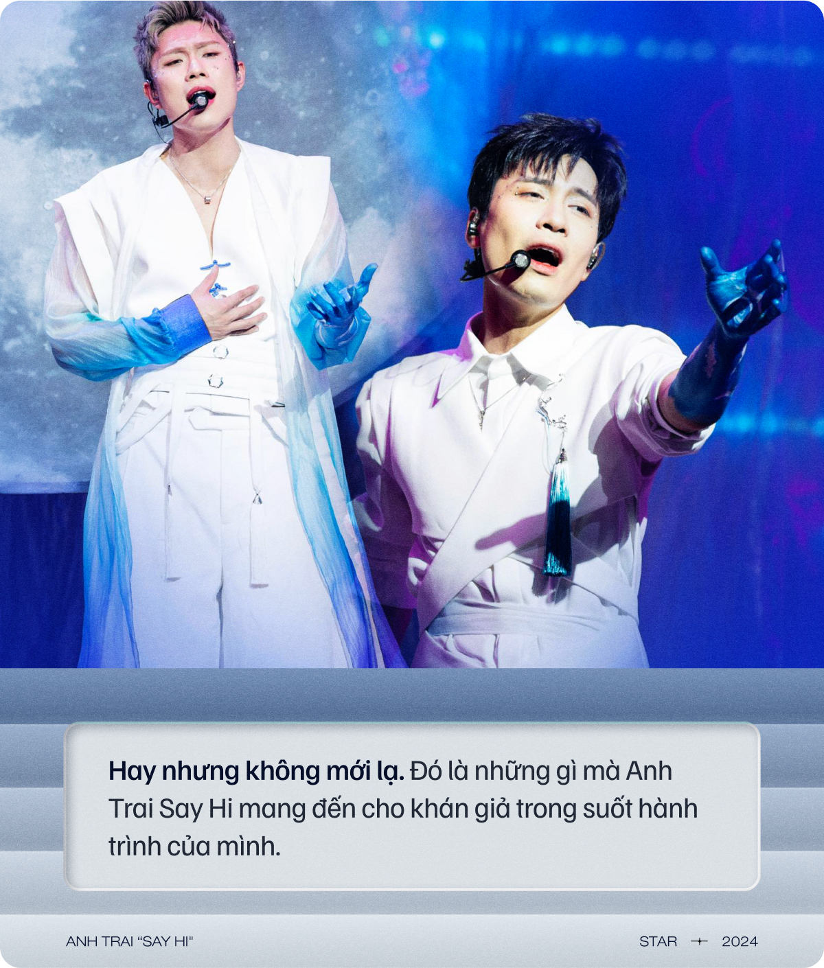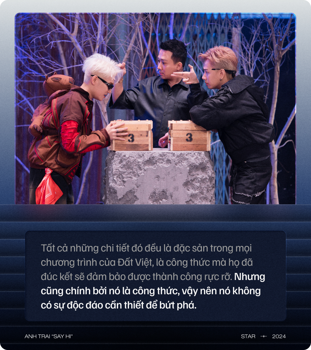 Tất cả những chi tiết đó đều là đặc sản trong mọi chương trình của Đất Việt, là công thức mà họ đã đúc kết sẽ đảm bảo được thành công rực rỡ. Nhưng cũng chính bởi nó là công thức, vậy nên nó không có sự độc đáo cần thiết để bứt phá. Âm nhạc, hài hước, trẻ trung - để nói đó là yếu tố tạo nên thương hiệu của Anh Trai Say Hi, nhưng để nói đó là yếu tố khiến nó trở nên đặc biệt hơn các chương trình khác của Đất Việt thì… không phải. Vẫn là những sân khấu rực rỡ, màu sắc và âm nhạc sôi động mang tính mainstream cao thường thấy ở Sóng hay The Masked Singer. Vẫn là những tiết mục trình diễn đậm chất "Rap Việt". Vẫn là kiểu quăng - thả miếng đã từng thấy ở Người Ấy Là Ai. Bạn hoàn toàn có thể xem những miếng hài ở 2 ngày 1 đêm chứ chẳng cần chờ đến Anh Trai Say Hi để thấy HIEUTHUHAI hay HURRYKNG quăng miếng với Atus và Song Luân. Và bạn cũng chẳng phải chờ đến Anh Trai Say Hi mới được thưởng thức những bài hát mới của các nghệ sĩ trong line-up, với sự tâm huyết mà họ có thể làm được cho chính những sản phẩm cá nhân hoặc đem đi thi trong bất cứ chương trình nào của Đất Việt. Hay nhưng không mới lạ. Đó là những gì mà Anh Trai Say Hi mang đến cho khán giả trong suốt hành trình của mình.