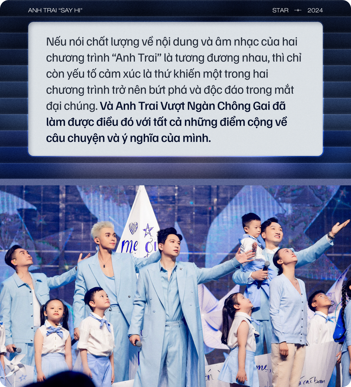 Đầu tiên, phải làm rõ, định vị về người xem mà hai show hướng đến hoàn toàn khác nhau. Anh Trai Say Hi hướng đến người xem trẻ tuổi, thuộc thế hệ Gen Z hoặc thậm chí trẻ hơn. ATVNCG lại hướng đến đối tượng từ 25- trên 30 tuổi. Chính vì thế, Anh Trai Say Hi tập trung vào yếu tố thuần giải trí với dàn thí sinh trẻ trung và visual long lanh, đi kèm âm nhạc thật trendy, cùng những tương tác vui vẻ và hài hước. Còn ATVNCG đào sâu vào yếu tố cảm xúc, câu chuyện nhân văn của từng anh tài đã và đang đi qua đỉnh cao sự nghiệp, cùng phần âm nhạc có thể đồng cảm được với nhiều độ tuổi.