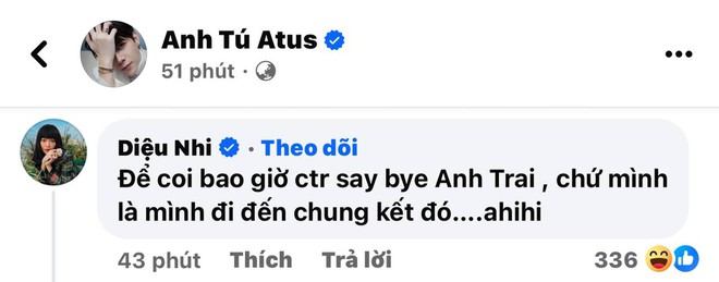 Ngay khi poster được đăng tải, chỉ ít phút sau bà xã Diệu Nhi đã lập tức tràn vào và để lại bình luận vừa 'cà khịa' chồng, vừa 'flex' thành tích của mình tại Chị Đẹp: "Để coi bao giờ chương trình say bye Anh Trai, chứ mình là mình đi đến chung kết đó... ahihi".
