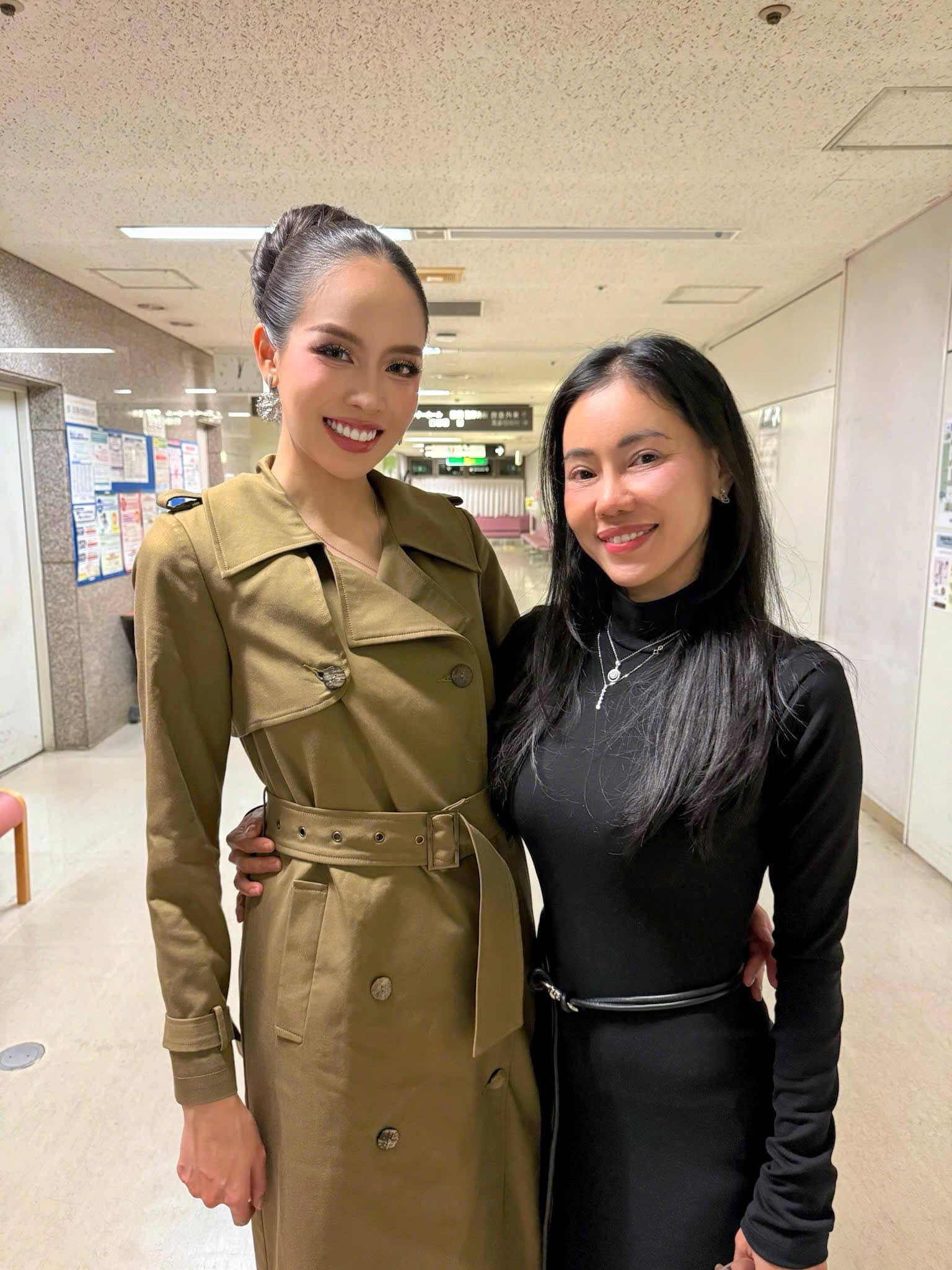 "Sau một hồi chờ đợi... vừa gặp là Thủy bảo "con lạnh quá" nên đưa luôn cái áo khoác cho con, thế là tiện khoe với mọi người áo của mình được đương kim Miss International mặc ngay sau khi đăng quang".