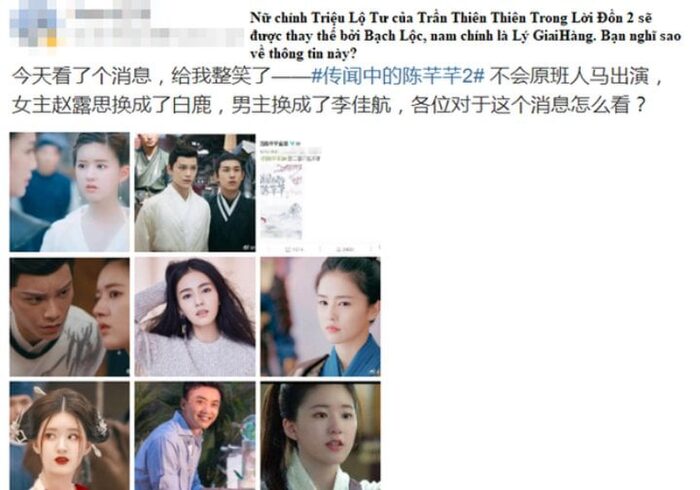 Trưa 5/3, các blogger xứ Trung đã chia sẻ thông tin về việc Bạch Lộc sẽ thay thế Triệu Lộ trong Trần Thiên Thiên trong lời đồn phần 2.