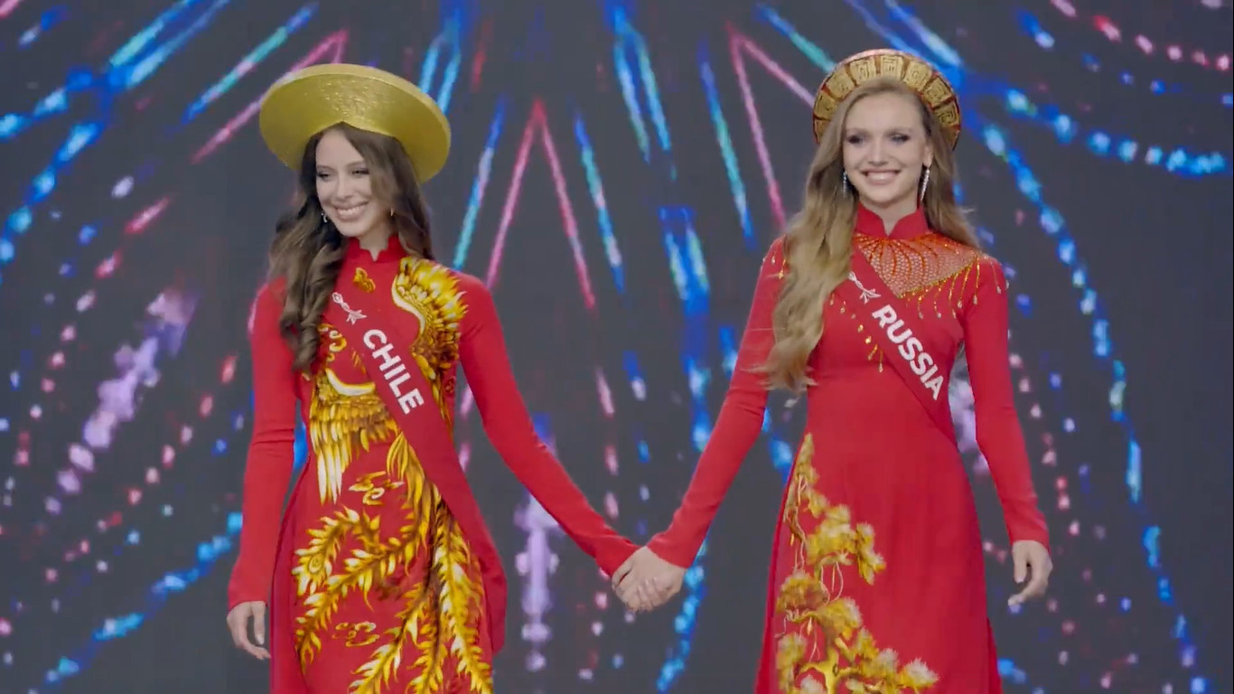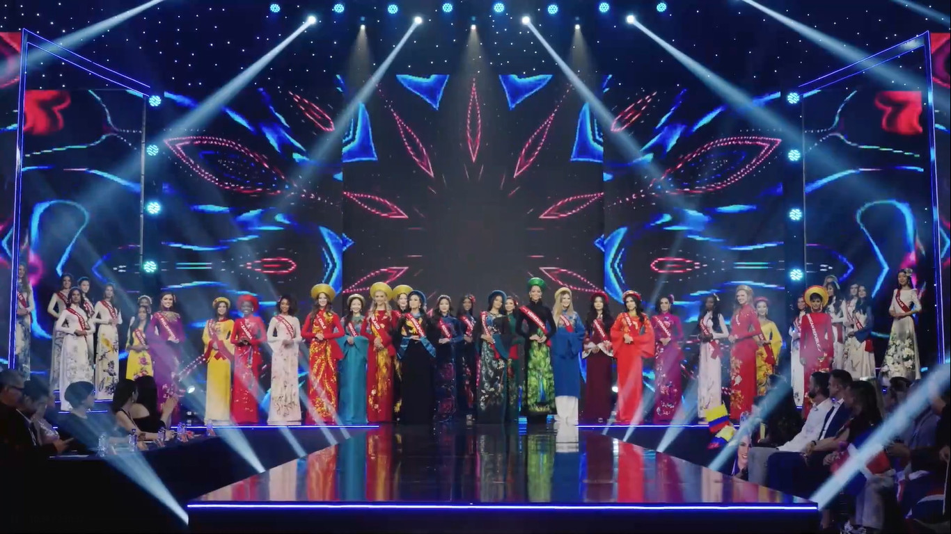 Sân khấu đêm bán kết Miss Charm 2023. Mở đầu đêm thi, dàn thí sinh đồng diễn trang phục áo dài của NTK Đinh Văn Thơ với nhiều màu sắc và chất liệu, họa tiết tôn vinh văn hoá Việt Nam. Đại diện Hà Lan và Hàn Quốc khoác tay nhau từ đầu đến cuối sân khấu.