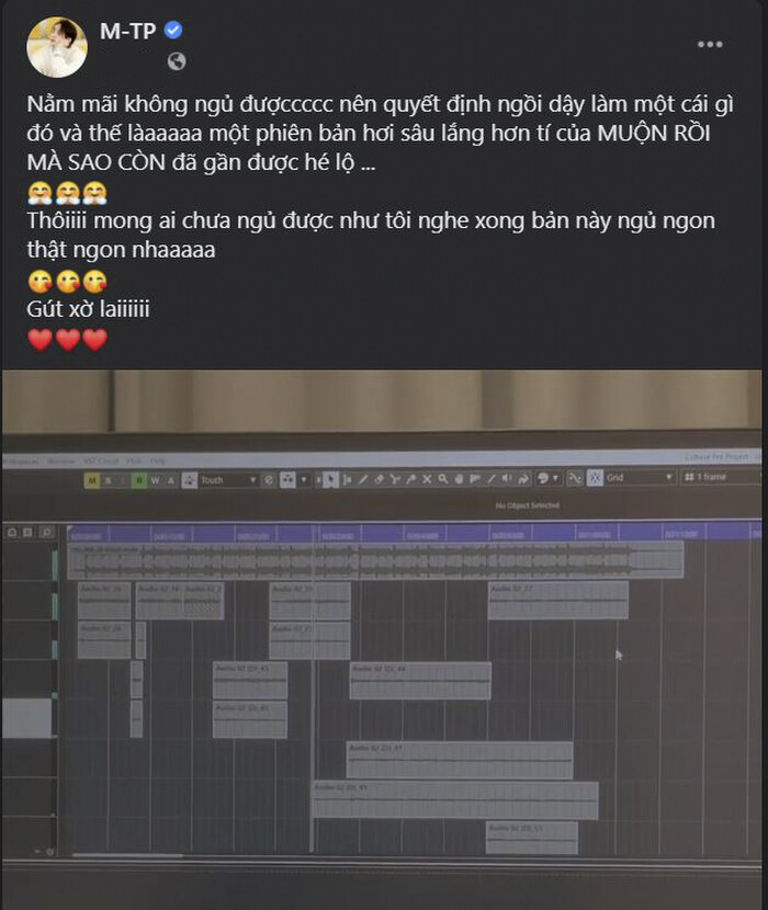 Sơn Tùng M-TP đã đăng tải đoạn clip bản phối mới với dòng trạng thái “Nằm mãi không ngủ đượccccc nên quyết định ngồi dậy làm một cái gì đó và thế làaaaaa một phiên bản hơi sâu lắng hơn tí của MUỘN RỒI MÀ SAO CÒN đã gần được hé lộ ...”.