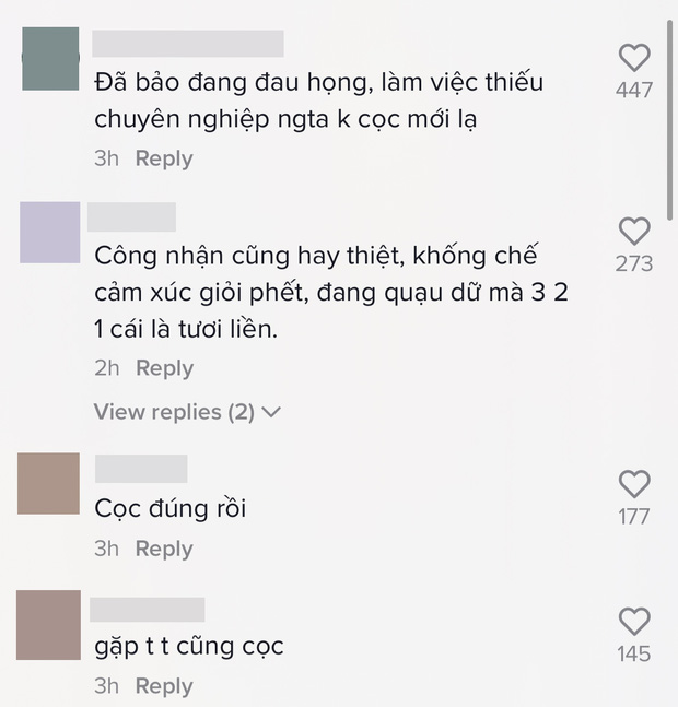 Bên dưới đoạn video, netizen hầu như đều lên tiếng bênh vực nữ ca sĩ: "Đã bảo đang đau họng, làm việc thiếu chuyên nghiệp người ta không cọc mới lạ", "Cọc là đúng rồi", "Phải tôi, tôi cũng cọc"...