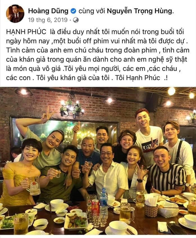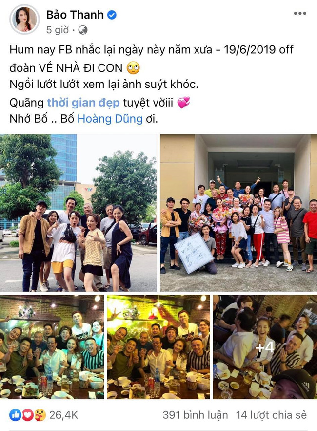 Nữ biên kịch cũng gây xúc động khi chia sẻ lại bài đăng của cố NSND Hoàng Dũng, vào đúng ngày này 2 năm trước. Hôm đó, đoàn phim Về nhà đi con tổ chức off đoàn và NSND Hoàng Dũng đã rất vui. Ông bày tỏ: "Tôi yêu mọi người, các em, các cháu, các con. Tôi yêu khán giả của tôi. Tôi hạnh phúc".