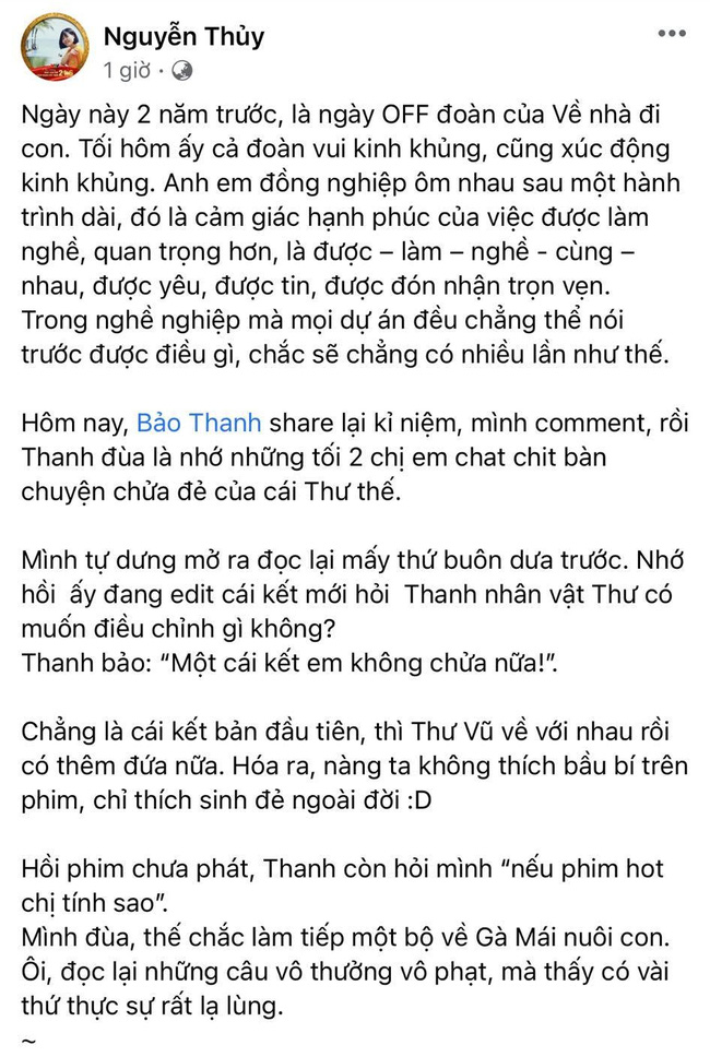 Sau khi Bảo Thanh chia sẻ kỷ niệm này, biên kịch Thu Thủy của Về nhà đi con cũng có một bài đăng bày tỏ cảm xúc cũng như chia sẻ những chuyện chưa kể về dự án phim đáng nhớ này.