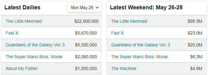 Bị Nàng Tiên Cá soán ngôi, trong 3 ngày cuối tuần vừa qua, Fast X chỉ thu về 23 triệu USD (tại thị trường Mỹ) - một con số đáng thất vọng cho tác phẩm đua xe hành động có kinh phí lên tới 340 triệu USD, đây cũng là phim tiêu tốn nhiều tiền nhất của thương hiệu.