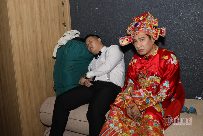 Dũng 'hớn' tranh thủ chợp mắt ở hậu trường Táo Quân bên cạnh nghệ sĩ Quang Thắng.