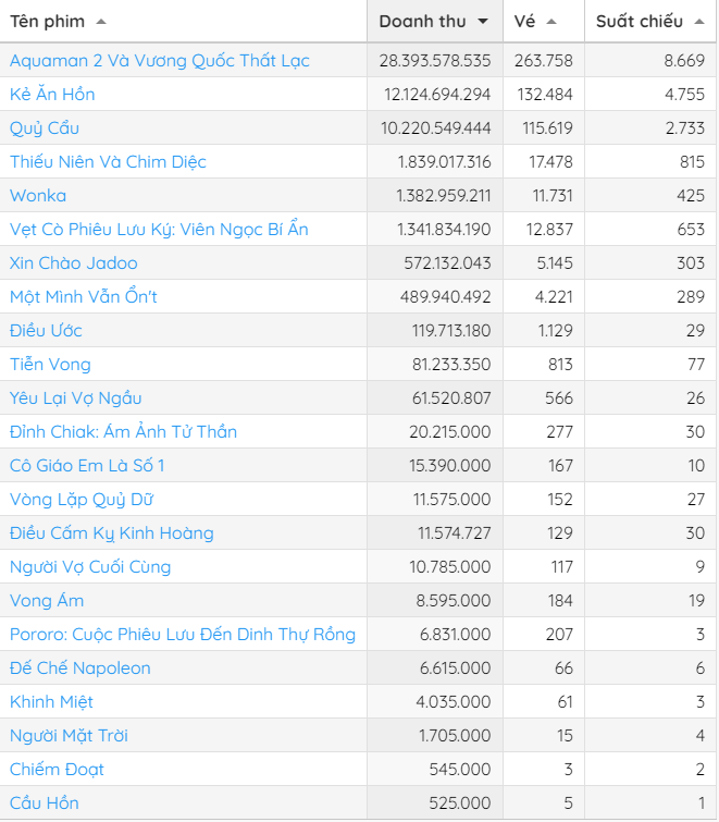 Tại Việt Nam, Aquaman 2 cũng lật đổ vị trí số 1 của Kẻ Ăn Hồn. Tuần trước, Kẻ ăn hồn bất ngờ vượt mặt nhiều bom tấn Hollywood để đứng đầu bảng tổng sắp doanh thu với hơn 30 tỷ đồng.