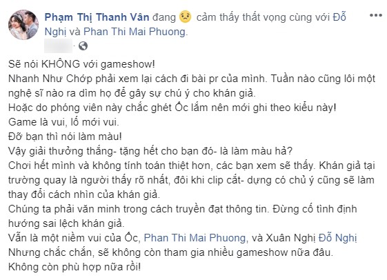 Trước sự việc này, nữ diễn viên đã đăng tải dòng trạng thái trên trang cá nhân bày tỏ sự uất ức vì "bỗng dưng" bị chỉ trích: "Sẽ nói KHÔNG với gameshow. Nhanh như chớp phải xem lại cách đi bài PR của mình. Tuần nào cũng lôi một nghệ sĩ nào ra dìm họ để gây sự chú ý cho khán giả".