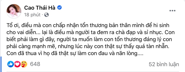 Trước áp lực dư luận, Cao Thái Hà đăng đàn chia sẻ trên Facebook cá nhân rằng: "Tổ ơi, điều mà con chấp nhận tổn thương bản thân mình để hi sinh cho vai diễn lại là điều mà người ta đem ra chà đạp và sỉ nhục. Con biết phải làm gì đây, người ta muốn làm con tổn thương đáng lý con phải càng mạnh mẽ, nhưng lúc này con thật sự thấy quá tàn nhẫn. Con đã thua vì họ đã thật sự làm con đau và nản lòng".