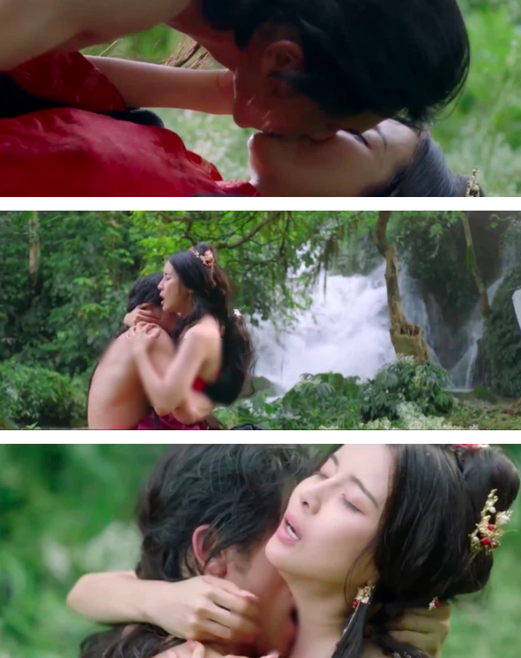 Ở phim Kiều, Hoạn Thư (Cao Thái Hà) có 3 đoạn diễn cảnh nóng gây đỏ mặt. Cảnh đầu tiên là "tự xử" sau khi tận mắt chứng kiến chồng mình - Thúc Sinh (Lê Anh Huy) gần gũi cùng Kiều (Trình Mỹ Duyên) trên đồng cỏ.