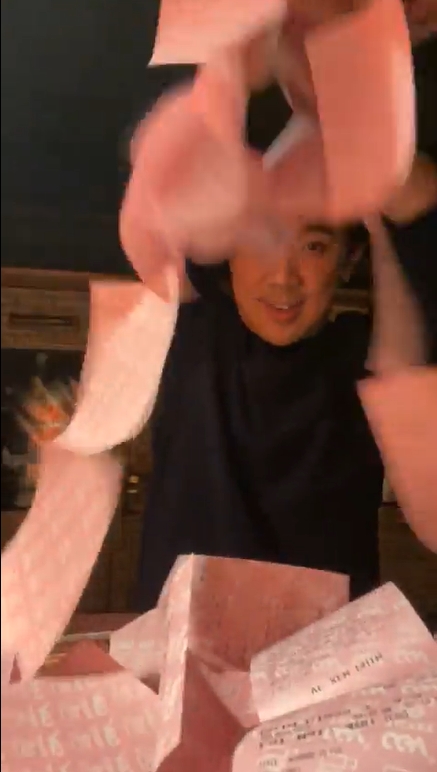 Ngay mở đầu livestream, Trấn Thành đã khoe một sấp vé Lật mặt: 48H được anh mua để ủng hộ đoàn phim. Tiếp đó, nam nghệ sĩ lên tiếng thanh minh về hành động share bài PR phim Hàn Quốc Bàn tay diệt quỷ: