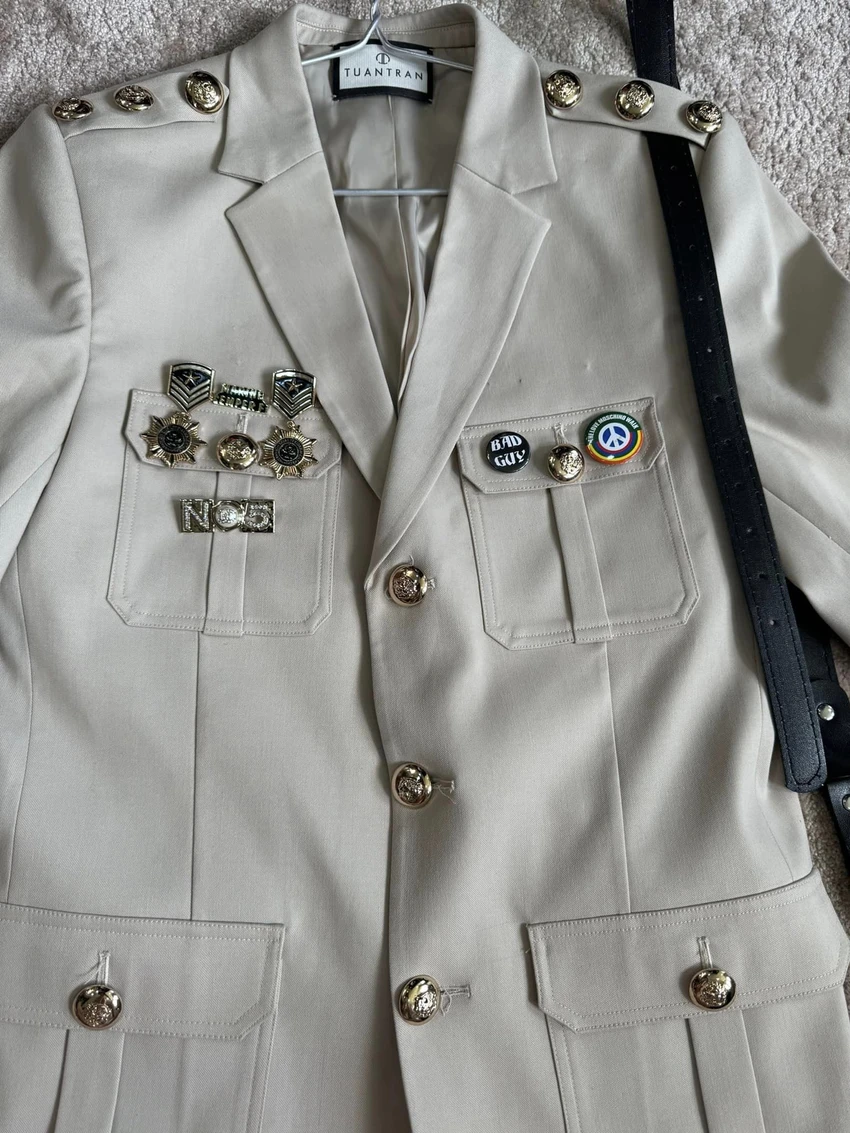 Đàm Vĩnh Hưng cũng chụp cận cảnh từng huy hiệu (pin cài) trên trang phục và khẳng định các huy hiệu là phụ kiện bình thường, mang tính chất trang trí, để bộ trang phục thêm phần bắt mắt khán giả.