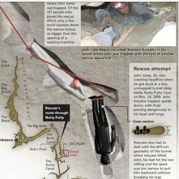 Phải cho đến khi phát hiện bản thân bị kẹt, John mới trở nên hoảng sợ. Anh không thể quay đầu, cũng không bò ngược trở ra được nữa. Thậm chí, cánh tay của John còn bị kẹt dưới người. Không gian nhỏ bé của chiếc hang cũng khiến phổi của John không thể lấy đủ không khí. Lúc này, người đàn ông bắt đầu vẫy vùng trong tuyệt vọng.