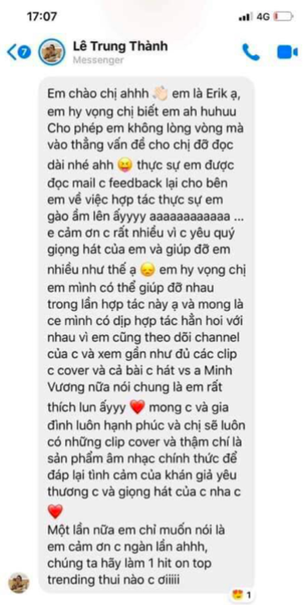 26/09/2019 15:49Bị lên án cover bài hát nghệ sĩ mới phát hành để kiếm tiền, đại diện Hương Ly tiết lộ tin nhắn của Erik gây hoang mang