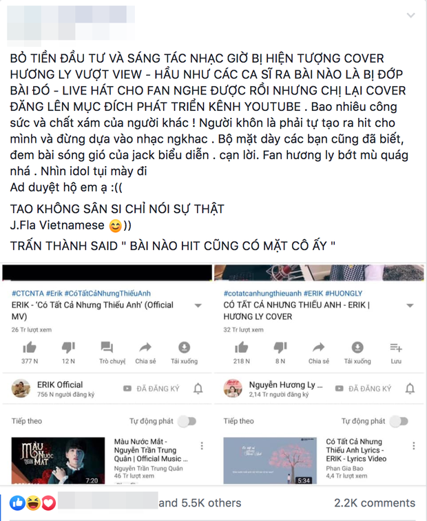 Dẫn chứng mà netizen đưa ra chính là ca khúc "Có Tất Cả Nhưng Thiếu Anh" của Erik. Chỉ 3 ngày sau khi MV của Erik ra mắt, bản cover của Hương Ly đã ra lò và hiện tại lượng view của phiên bản Hương Ly cover còn cao hơn cả MV chính của Erik. Nhiều người thắc mắc rằng dù có xin bản quyền thì vì sao Hương Ly không đợi ca khúc ra mắt được 1-2 tháng sau hẵng cover. Ngoài ra, một vài điểm khiến netizen "không ưa" ở Hương Ly đó là chất giọng không quá hay, chỉ toàn autotune... Có vẻ như đây là quan điểm của "antifan Hương Ly" chính hiệu.