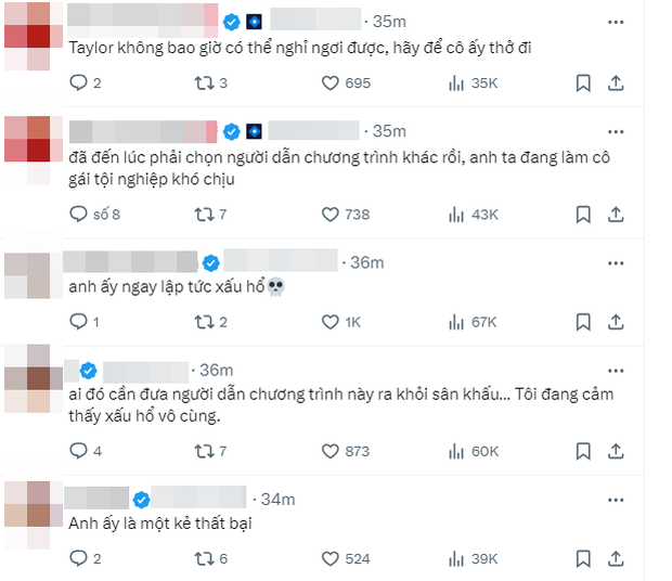 Khoảnh khắc Taylor Swift trở thành "nạn nhân" của nam MC Quả Cầu Vàng 2024 đang được tranh luận dữ dội trên MXH X. Nhiều người chê bai Jo Koy là MC tệ nhất lịch sử lễ trao giải khi có phần mở màn tệ hại, nhạt nhẽo, và sau đó là câu đùa vô duyên hướng đến nghệ sĩ. "Taylor không thể nào thoải mái nổi... Cho cô ấy thở tí đi", "MC tệ nhất lịch sử, xem mà đau cả mắt", "Ai đẩy ông này xuống được không?", "Người lên nhận giải phát biểu còn hài hơn MC",... cư dân mạng đang bày tỏ sự bất bình trên MXH và cụ thể là hướng đến MC Jo Koy.