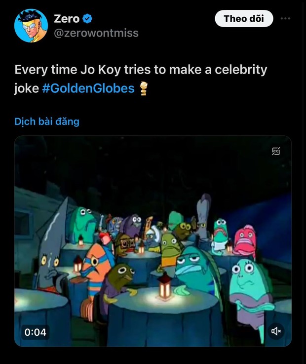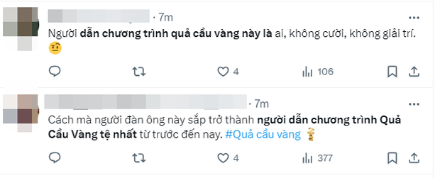 Khán giả bày tỏ sự phẫn nộ và bất bình với MC dẫn chính Quả Cầu Vàng lần này - Jo Koy. Đặc biệt, câu đùa của nam MC dành cho Taylor Swift đang tạo nên làn sóng giận dữ trên MXH. Cụ thể, Jo Koy đã đùa rằng "Sự khác nhau giữa việc xem Quả Cầu Vàng và xem NFL đó là tại Quả Cầu Vàng, sẽ có ít khoảnh khắc máy quay hướng đến Taylor Swift hơn".
