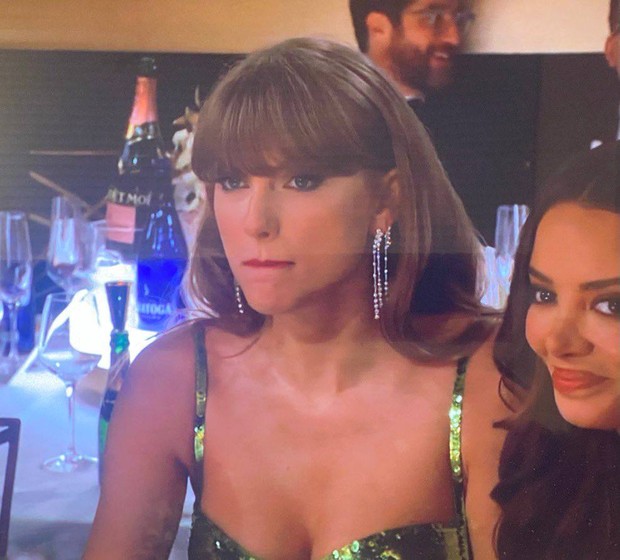 Lúc này, máy quay hướng đến Taylor Swift và bắt trọn phản ứng "sượng trân" rõ rệt của nữ ca sĩ. Phản hồi lại câu đùa của Jo Koy, Taylor Swift chỉ biết quay đi và uống rượu.