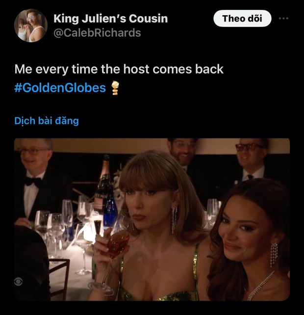 08/01/2024 18:34Bị MC đùa vô duyên tại Quả Cầu Vàng, Taylor Swift phản ứng 'sượng trân' khiến cả MXH phẫn nộ