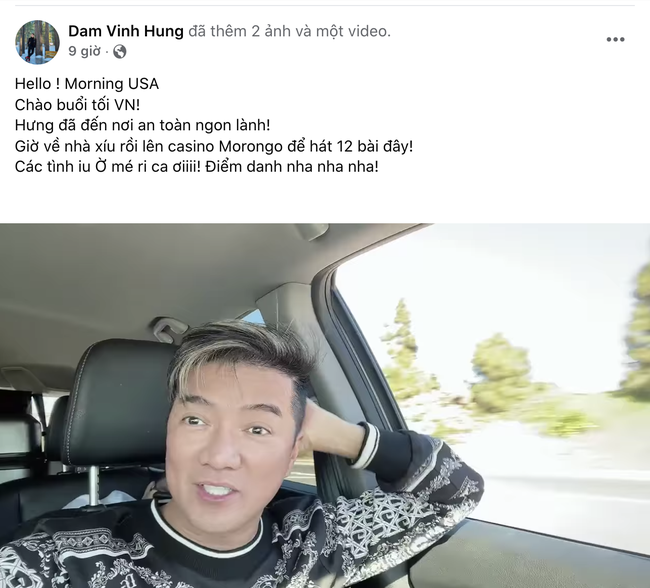 Sau ồn ào đêm diễn tại các phòng trà, sân khấu lớn ở TP.HCM và Đà Lạt, mới đây Đàm Vĩnh Hưng đã đăng tải hình anh xác nhận đã tới Mỹ để chuẩn bị cho đêm diễn tại xứ cờ hoa. Trên Facebook cá nhân, Đàm Vĩnh Hưng chia sẻ rằng: "Hello. Morning USA. Chào buổi tối Việt Nam. Hưng đã đến nơi an toàn ngon lành. Giờ về nhà xíu rồi lên Casino Morongo để hát 2 bài đây. Các tình yêu ở America ơi. Điểm danh nha".