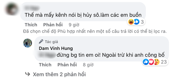 Dưới phần bình luận bài đăng của Đàm Vĩnh Hưng, nhiều netizen hỏi thẳng nam ca sĩ về tin đồn bị hủy show ở Mỹ do ồn ào với nữ CEO. Lập tức, Đàm Vĩnh Hưng không ngại đáp ngay: "Đừng bao giờ tin em ơi. Ngoại trừ khi anh công bố".