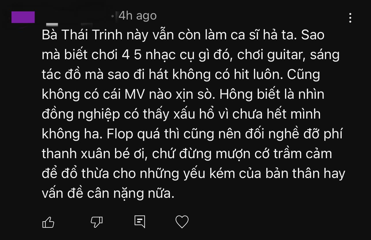 Mới đây, Thái Trinh vừa gây chú ý khi đăng tải bức tâm thư dài trên trang cá nhân để trải lòng về chuyện làm nghề. Cô cho biết mình vừa đọc được dòng bình luận từ một vị khán giả kém duyên. Người này cho rằng Thái Trinh nên đổi nghề, không nên làm ca sĩ nữa vì đi hát mãi mà không có hit hay cho ra mắt những MV được đầu tư kỹ lưỡng. Thậm chí, netizen này còn mỉa mai Thái Trinh "flop", không nên mượn cớ trầm cảm để đổ thừa cho yếu kém của bản thân cũng như vấn đề cân nặng.