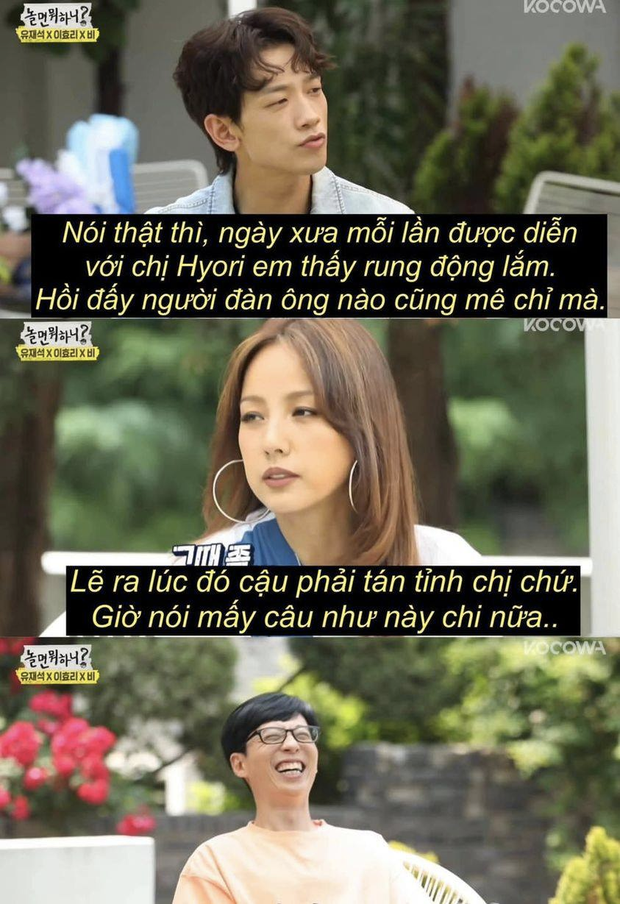 Ông xã Kim Tae Hee chia sẻ: "Nói thật thì, ngày xưa mỗi lần được diễn với chị Hyori em đều thấy rung động. Lúc đó, người đàn ông nào cũng thích chị mà". Trước lời chia sẻ chân thành của đàn em, Lee Hyori thẳng thừng đáp lại: "Lẽ ra lúc đó cậu phải tán tỉnh chị chứ, giờ nói mấy câu này làm gì nữa".