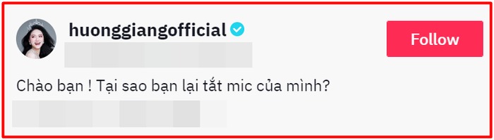 Đăng tải đoạn clip biểu diễn trên, Hương Giang khiến nhiều người không nhịn được cười khi đính kèm dòng chú thích: "Chào bạn! Tại sao bạn lại tắt mic của mình?". Được biết, dòng chú thích này được Hương Giang "biến tấu" lại dựa trên câu nói của một hiện tượng mạng đình đám, rất viral với giới trẻ như sau: "Chào bạn! Bạn có phải là người đăng cái status này không?".